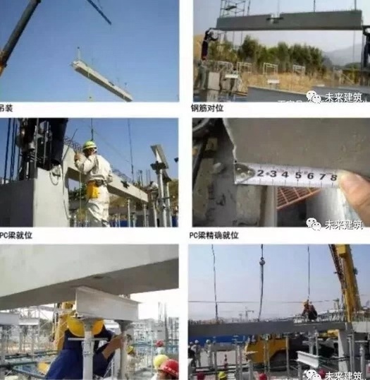 预制梁吊至梁支座位置时,缓慢落钩并同时对准基准线就位。事先支撑架设好的排架应按梁底标高固定好,可调节支撑根据梁降落就位时随时调节。