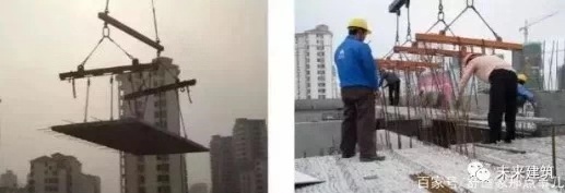 (3)叠合板要从上垂直向下安装,在作业层上空20cm处略作停顿,施工人员手扶楼板调整方向,将板的边线与墙上的安放位置线对准,注意避免叠合板上的预留钢筋与墙体钢筋碰撞,放下时要停稳慢放,严禁快速猛放,以避免冲击力过大造成板面震折裂缝。5级风以上时应停止吊装。