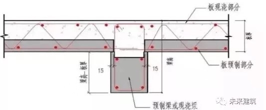 预制部分与梁连接,一端固定,一端滑动。