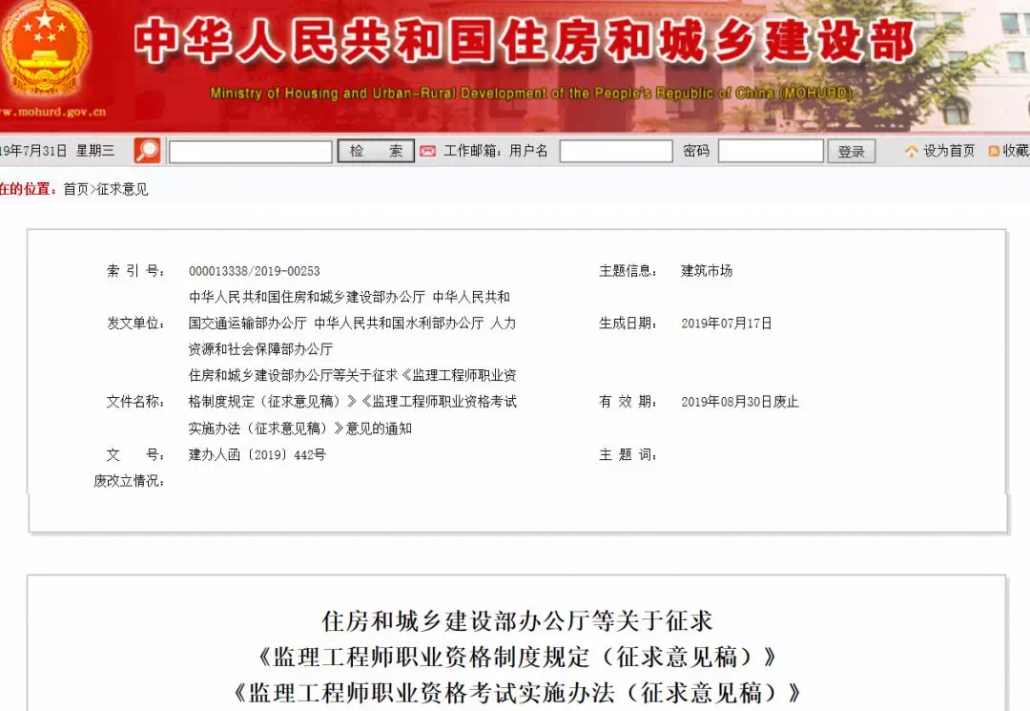根据国家职业资格制度改革精神,住房和城乡建设部、交通运输部、水利部、人力资源和社会保障部共同起草了《监理工程师职业资格制度规定(征求意见稿)》《监理工程师职业资格考试实施办法(征求意见稿)》,现征求你们意见,请于2019年8月30日前将意见函告住房和城乡建设部建筑市场监管司。
