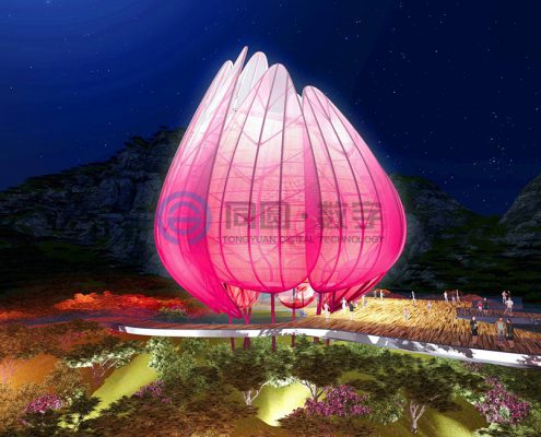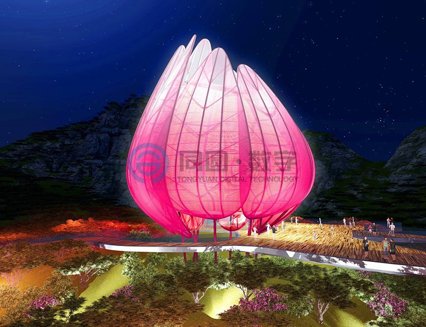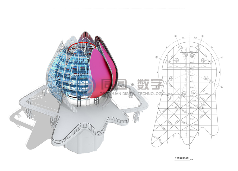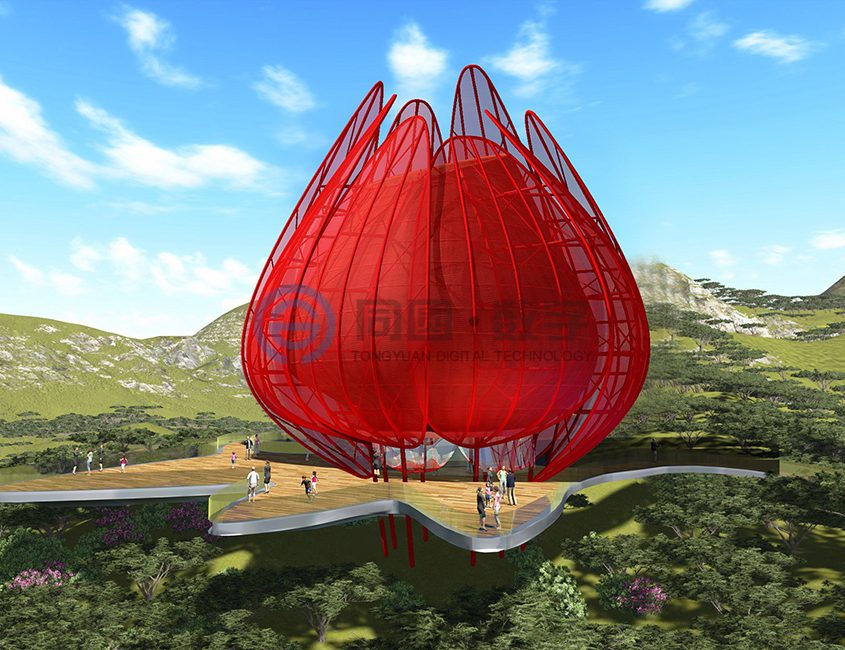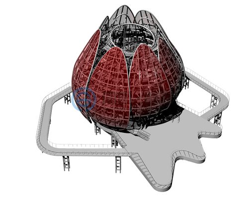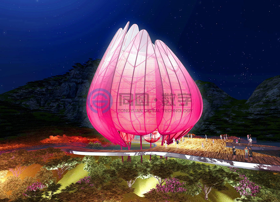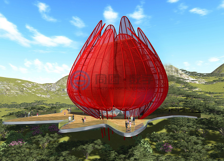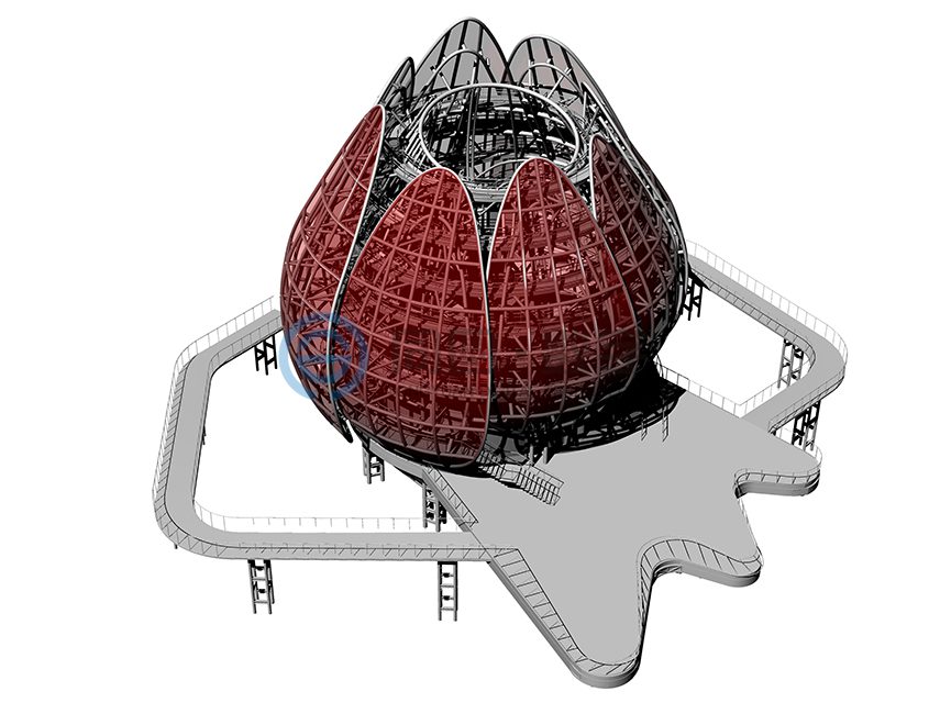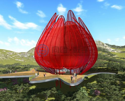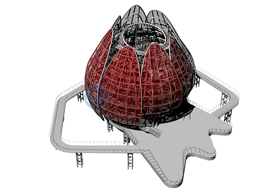 青岛世园会主题标志物坐落于世园区东北部山脉边缘天水湖畔旁,地势较高,可独览世园全局风貌,得天独厚的地理位置使之成为园区独一无二的观赏夜景、纵观全局的绝佳视觉窗口。 该项目建筑面积1500平米,上部结构高31米(寓意第31届世界园艺博览会)、地下18.5米,地下为钢筋混凝土结构,地上为钢结构,形态上将荷花和青岛市花耐冬融合。