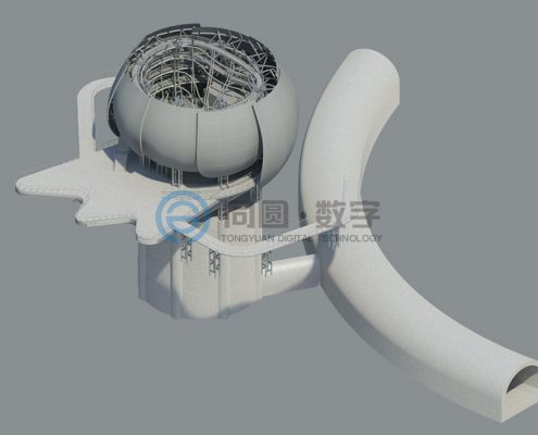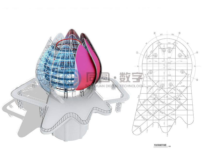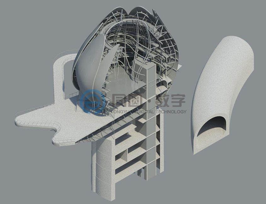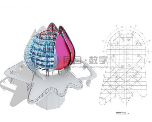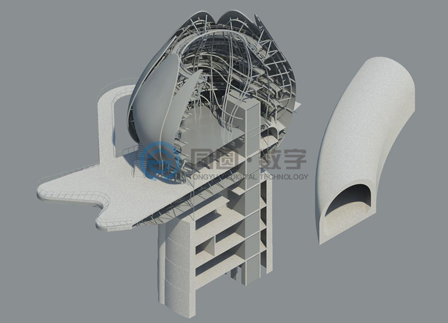 在BIM应用过程中,针对异形建筑平面表达难度较大的实际情况,充分结合各种专业软件的优势,在异型建筑的设计中采用“BIM团队先进入设计流程,设计人员后加工出图”的方式,保证了设计质量和进度,取得了方案方、业主方的一致认可。